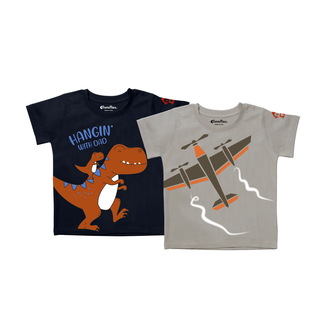 Boys’ 100% Bio-Wash Cotton T-Shirt Combo of 2 – Dinosaur & Airplane Prints – Soft & Breathable Kids Tees (Pack of 2)