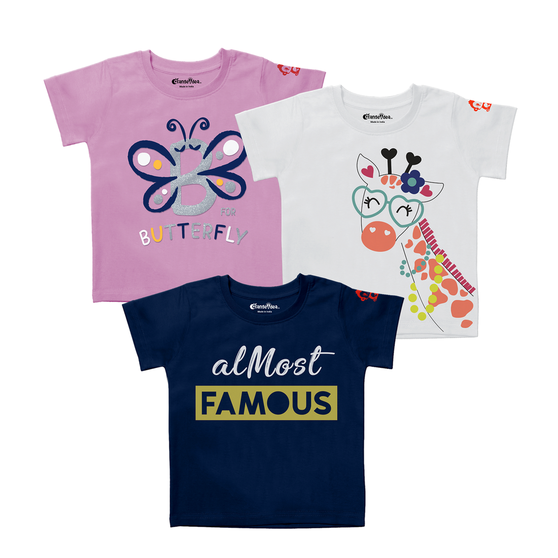 Girls’ 100% Bio-Wash Cotton T-Shirt Combo – Butterfly, Giraffe & Almost Famous Prints – Soft & Breathable Kids Tees (Pack of 3)