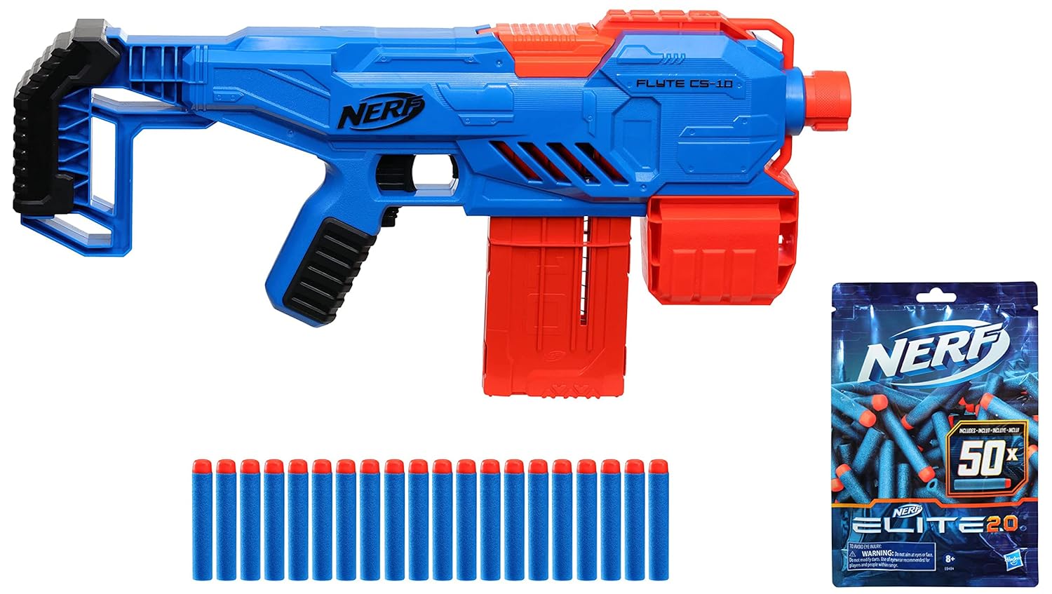Product 2: 50-DART NERF REFILL PACK: Includes 50 Official Nerf Elite 2.0 foam darts to keep you stocked with firepower for all your Nerf battles and missions. Tested and approved for performance and quality