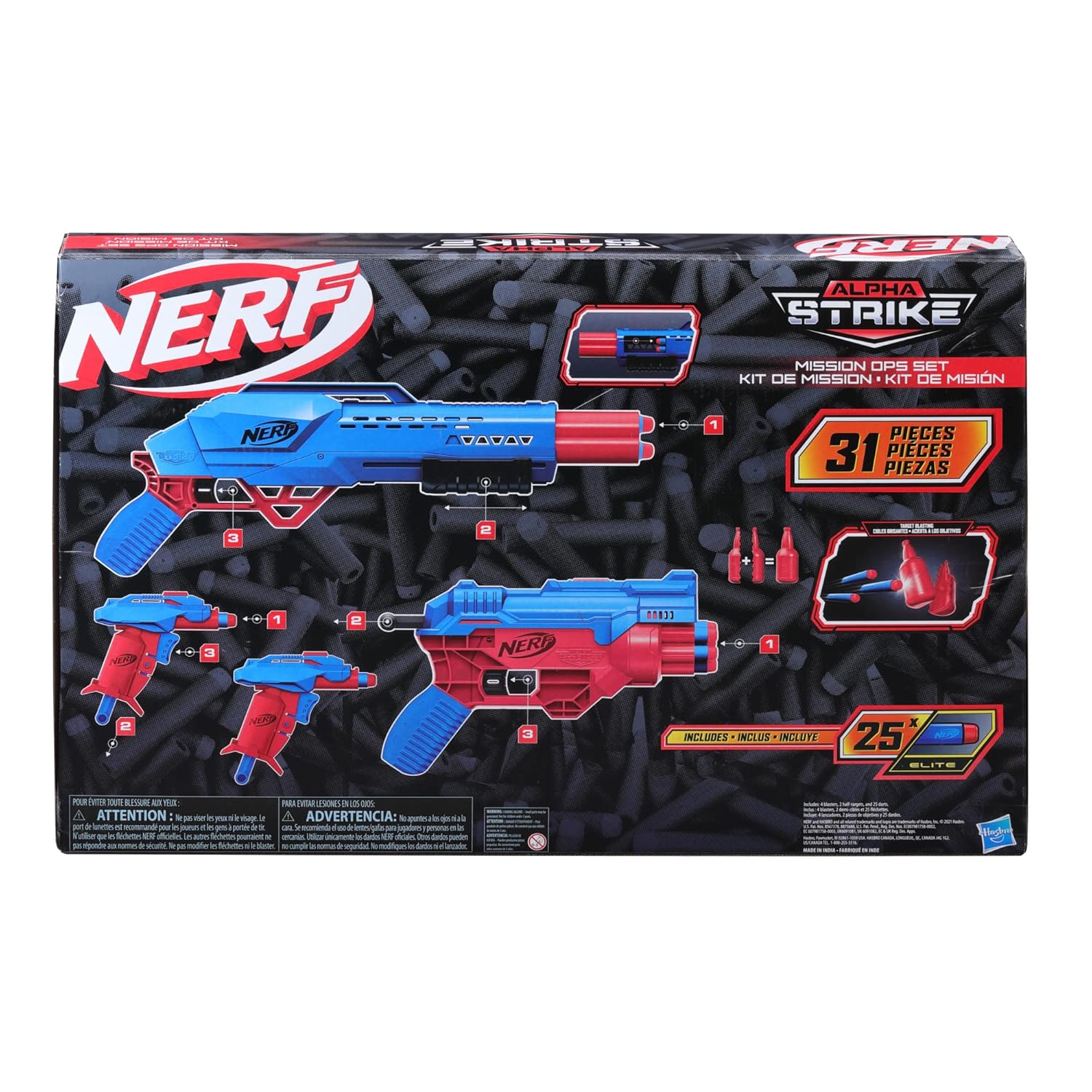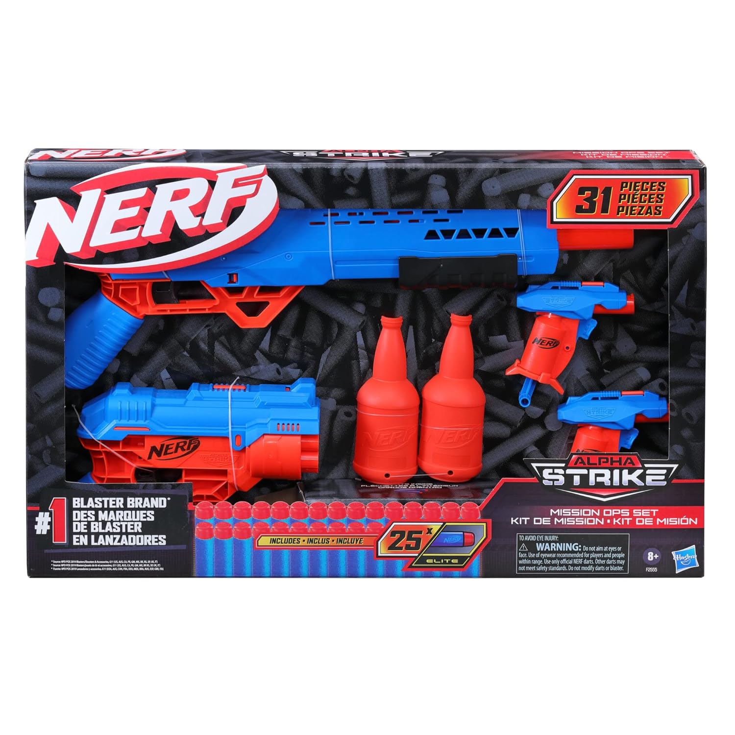 31-PIECE SET: Great for gift-giving, parties, or any time you want to blast into exciting Nerf games -- includes 4 Nerf Alpha Strike blasters, 2 half-targets, and 25 Official Nerf Elite darts