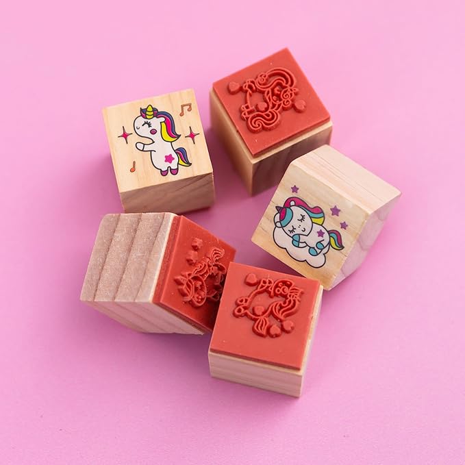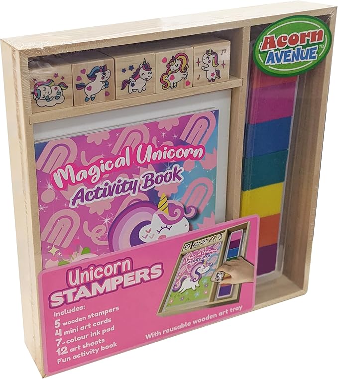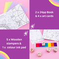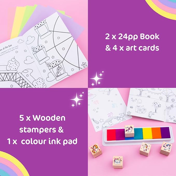 - ALL-IN-1-KIT: The Unicorn Wooden Stamper Kit contains everything you need to get started straight away; 5 Wooden Unicorn Stampers, 7-Colour Ink Pad, 4 Mini Art Cards, 2 x 24pp Activity Books.