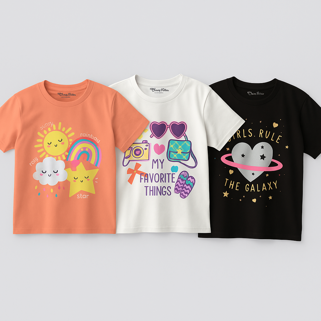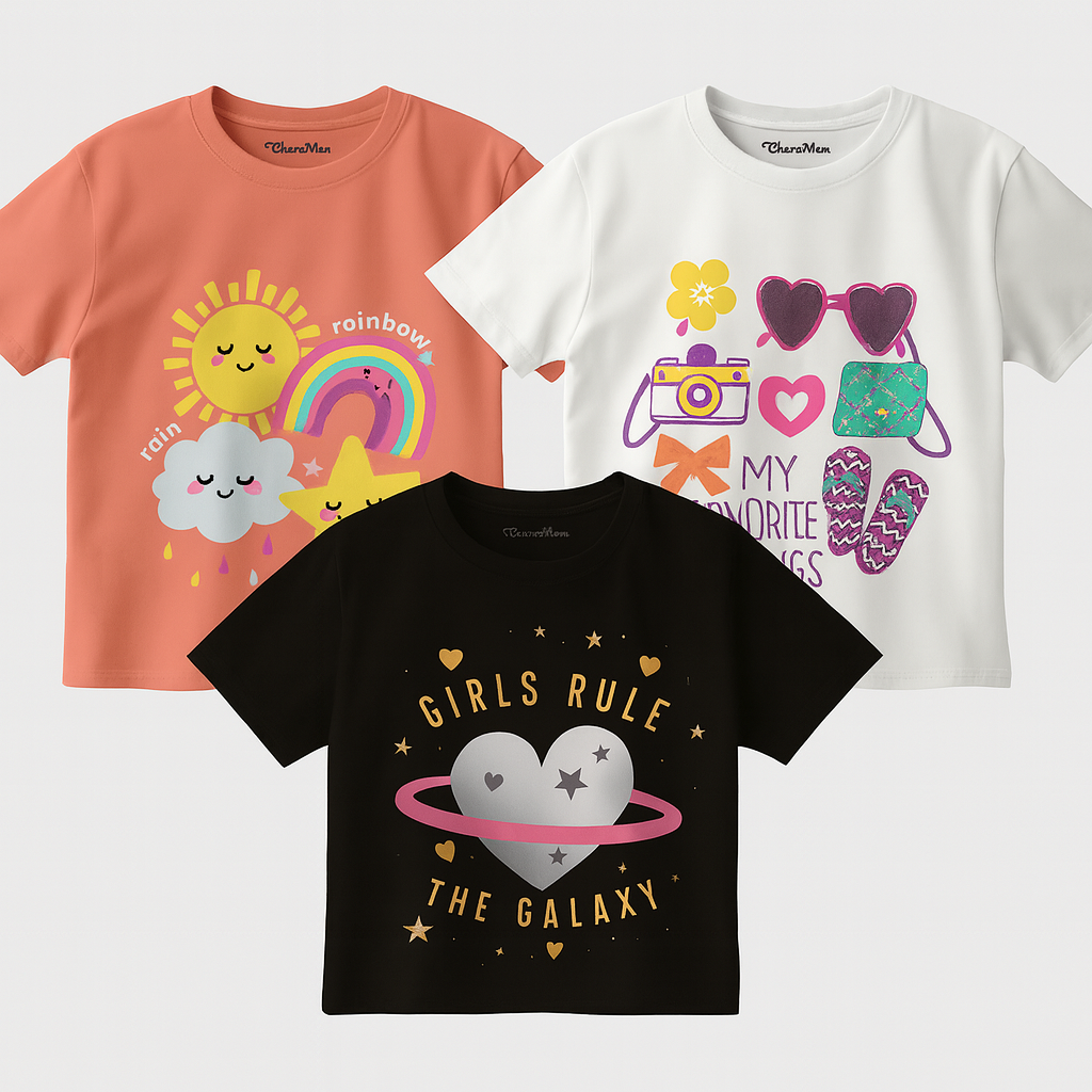 Girls 3PC T-Shirt Combo - Sunny Day, My Favorite Things & Girls Rule the Galaxy | Premium Bio-Wash Cotton