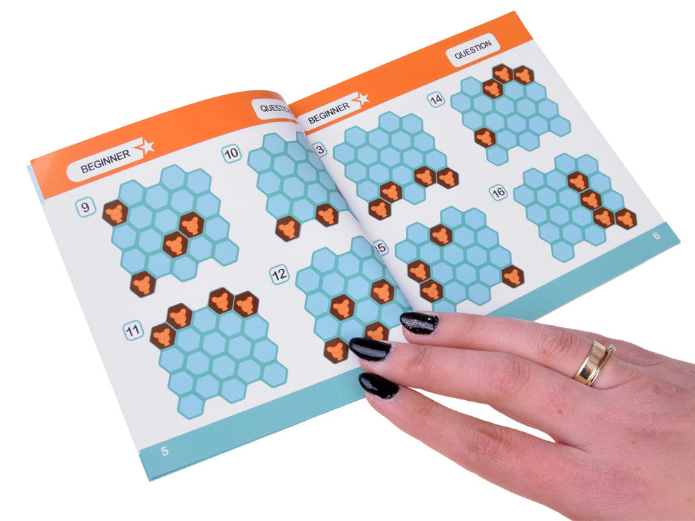 There are 60 puzzles in the accompanying booklet divided by difficulty level. The levels are marked with colors and stars. Choose one of the puzzles and arrange the deer as shown in the picture. The task of the child is to arrange the compartments so that all the fields on the board are occupied. You cannot move or remove deer from the board during the game.