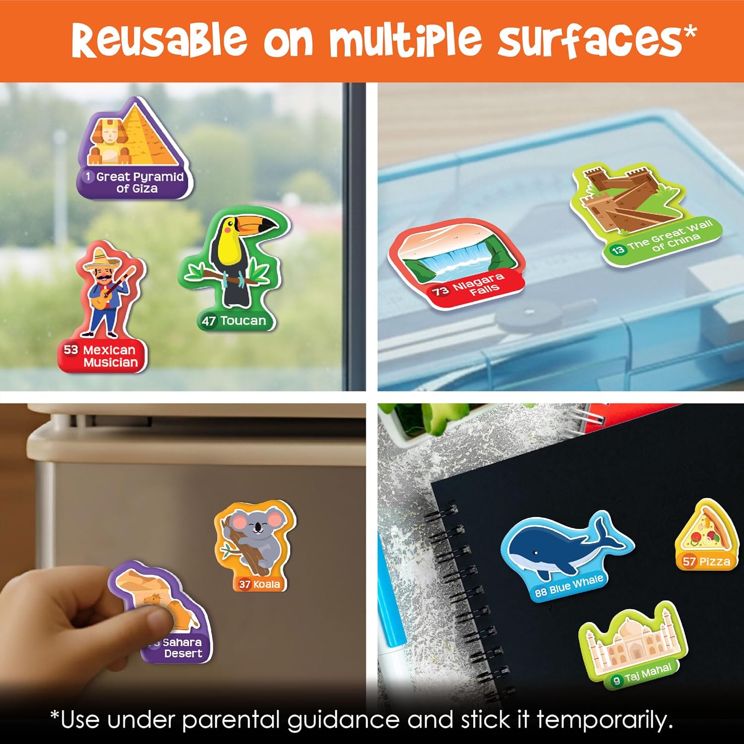 - WHAT YOU GET: 1 World Map, 102 Reusable Sticker, 1 Sticker Book, 1 Sand Timer, 2 Spinner, Instruction Book