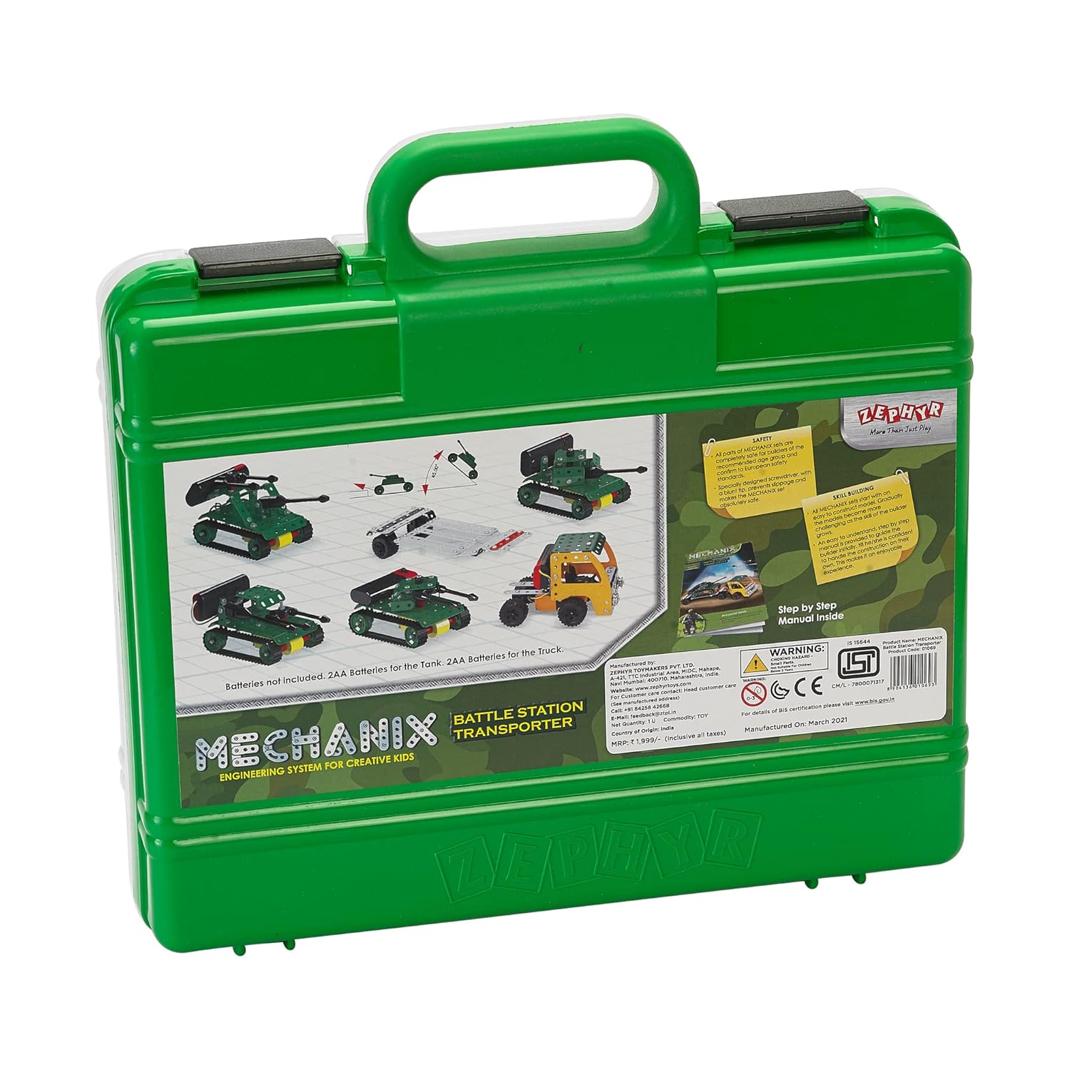 Mechanix Battle Station Transporter Smart Bag is an engineering set that keeps children actively engaged and also stimulates their overall development. This metal building toy set comes with 353 pieces of reusable parts that need to be assembled to make 5 working models. All the pieces included in this game have been made from high-quality steel that bestows them with an amazing hardiness, enabling them to retain their effectiveness for years. At the same time, these parts are non-toxic, so they are completely safe for kids to play with.Teaches about art of designing and construction. Helps creating various models with your own imagination. Learns basics techniques of constructing mechanix instrument/tools.How to play: Step by Step fix the spare parts with help of bolts and nuts. To fit the bolts tightly, make use of spanner holding the nuts , given inside the box. Assemble accordingly the whole process to make your Mechanix Battle Station Transporter fly, run, lift and swing