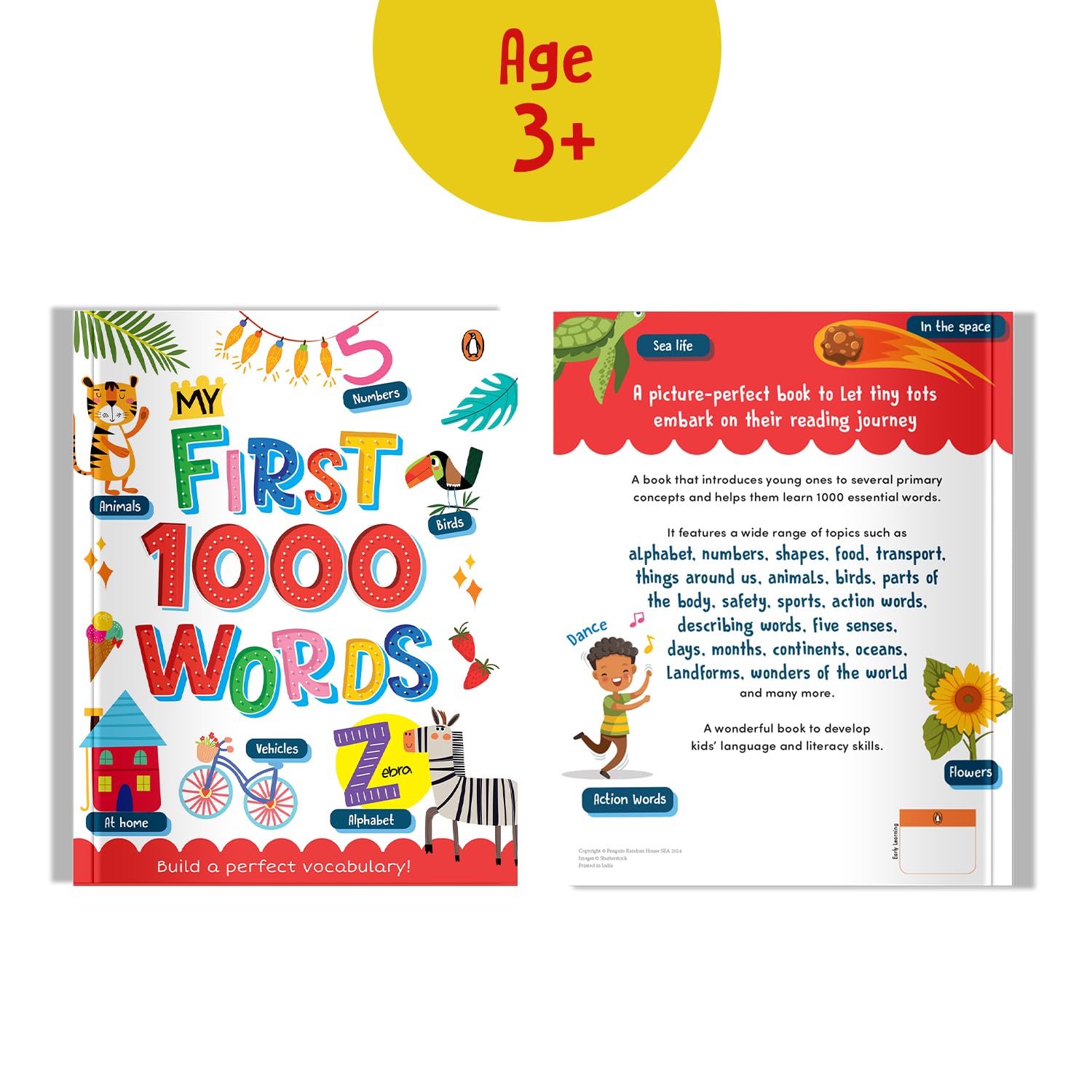 A big, beautiful picture book that introduces young ones to several primary concepts and helps them learn 1000 essential words. It features a wide range of topics such as the alphabet, numbers, shapes, food, transport, things around us, animals, birds, parts of the body, safety, sports, action words, describing words, five senses, days, months, continents, oceans landforms, wonders of the world and many more.