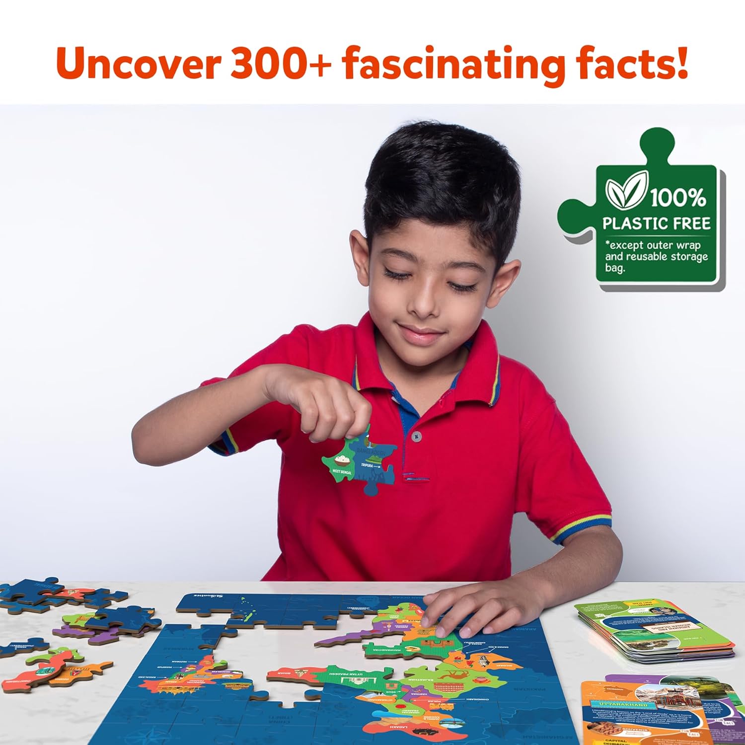 - ASSEMBLE & LEARN: Spread out the puzzle pieces on a flat surface and let your child assemble the puzzle. Once completed, use the cards to learn all about states, union territories and their capitals!
