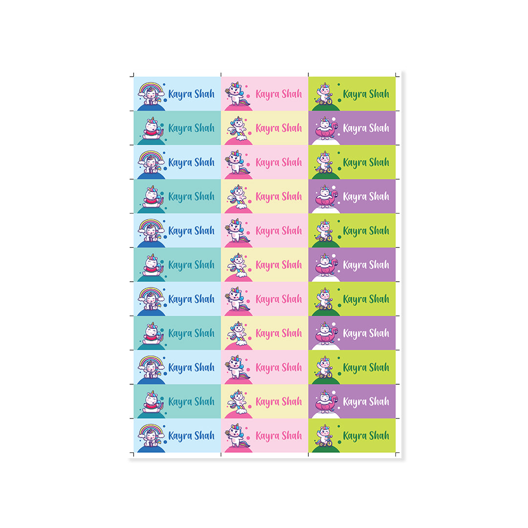 Ultra-durable waterproof name stickers in a cute Unicorn theme. Perfect for lunchboxes, bottles, books and more.